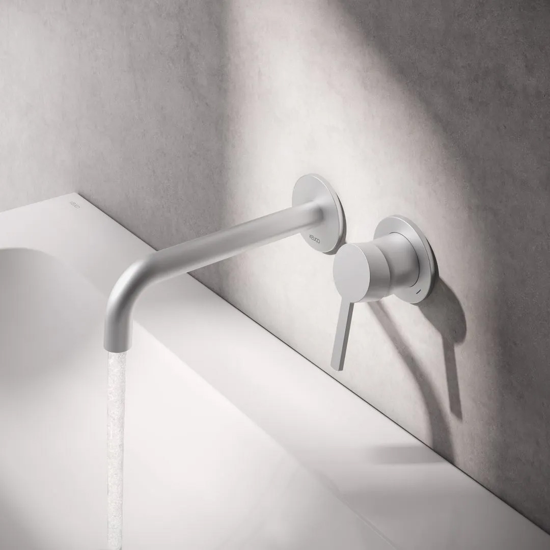Die Armatur verleiht dem Waschtisch mit ihrem filigranen Bogenauslauf, erhältlich in den Längen 165 mm und 225 mm, eine gewisse Leichtigkeit. Die Klarheit des Designs wird durch die gleichgroßen Rosetten des Auslaufs und des Hebels unterstrichen. Hier werden bei KEUCO keine Kompromisse gemacht: Die Symmetrie und die feinen Linien der Formen wirken ausgesprochen ästhetisch. Je nach Raumsituation und Vorliebe kann dank des 2-Loch-Grundkörpers der Griff individuell links oder rechts vom Auslauf angeordnet werden.